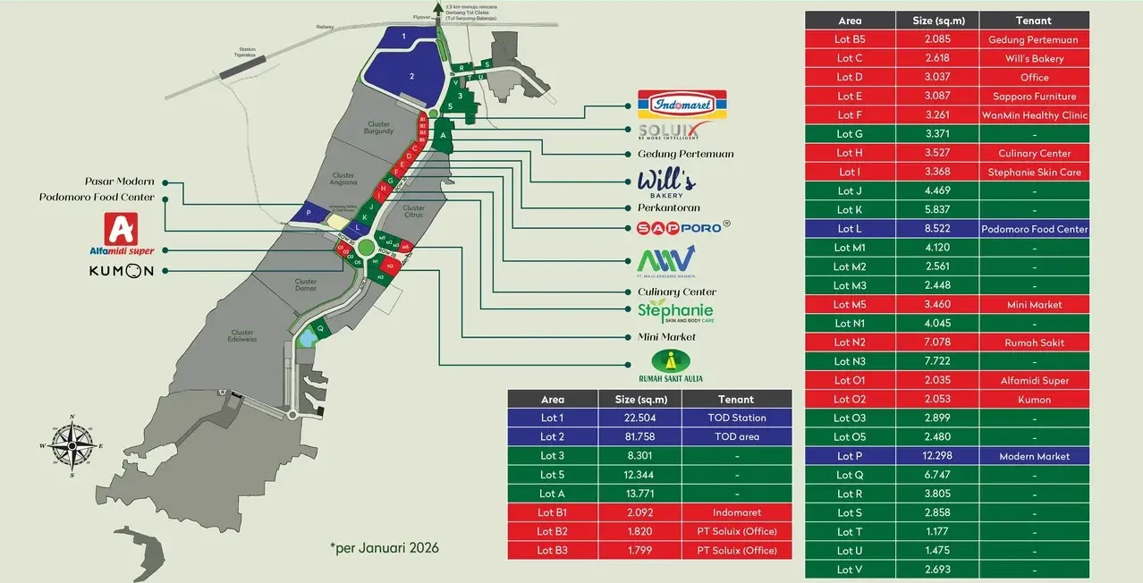 Area komersial di Kota Podomoro Tenjo dirancang sebagai pusat kegiatan ekonomi dan bisnis yang terintegrasi dalam konsep kota mandiri modern. Berlokasi strategis di koridor utama kawasan serta berdekatan dengan area Transit-Oriented Development (TOD), kawasan ini memiliki keunggulan aksesibilitas yang tinggi.